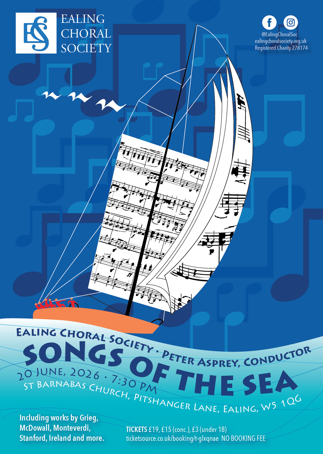 The first half of our June concert will focus on the sacred music of the sea, with four contrasting settings of Ave Maris Stella (Hail Star of the Sea) and other works that explore the sea as a metaphor for the journey of life. The second half is secular, with Stanford’s buoyant Songs of the Fleet introducing a half of sea songs and shanties. A fun and uplifting end to our 2025-26 season.